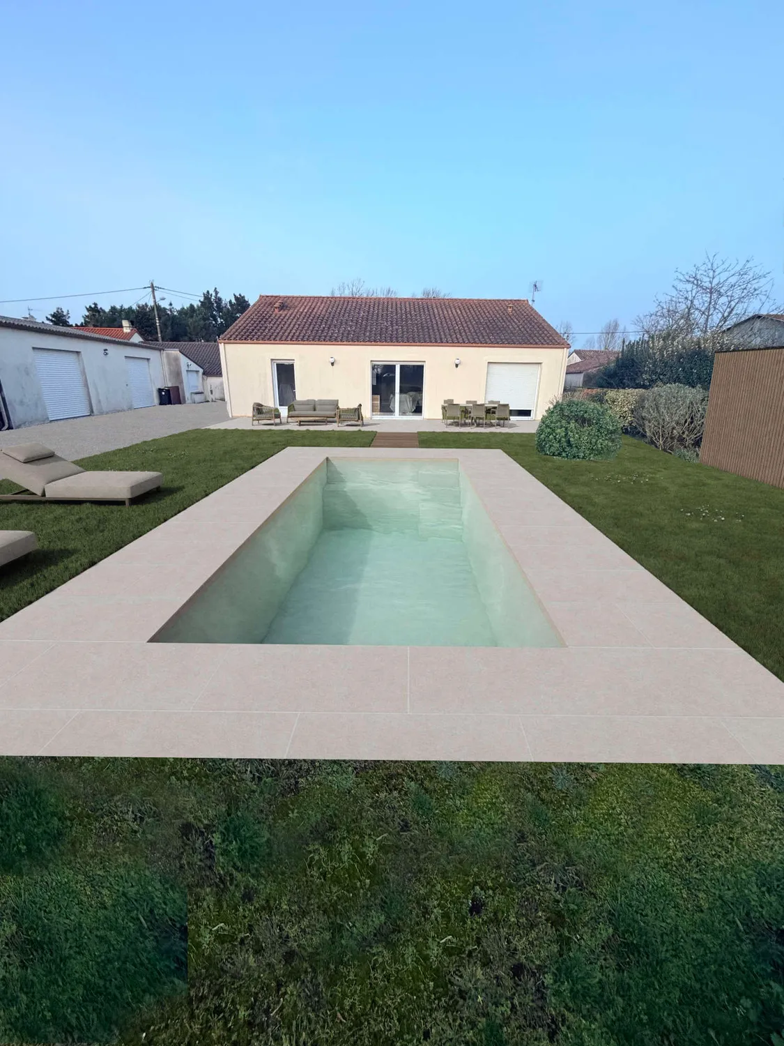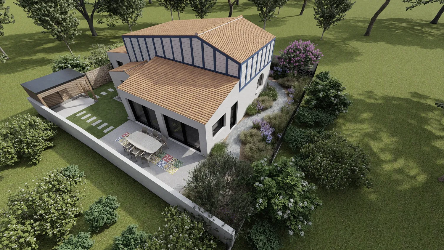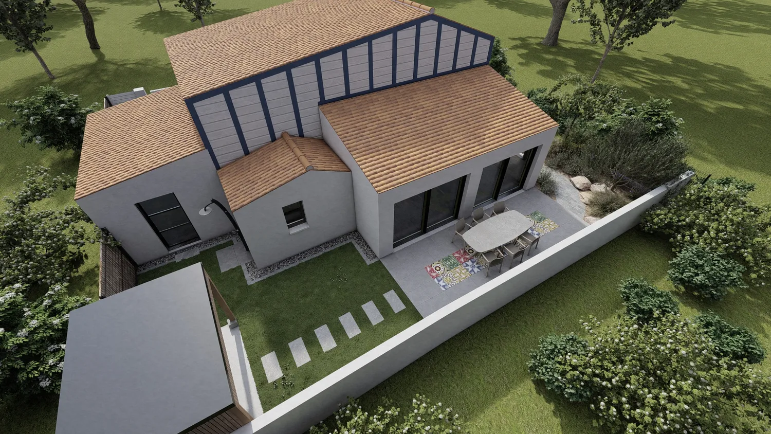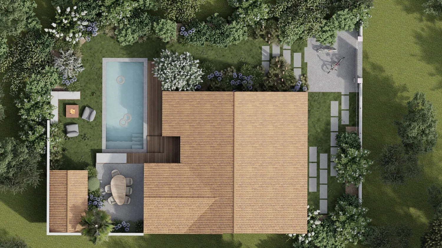 Visualisation des terrasses bois ou minérales, des zones repas et des espaces de détente pour imaginer pleinement votre futur espace extérieur.